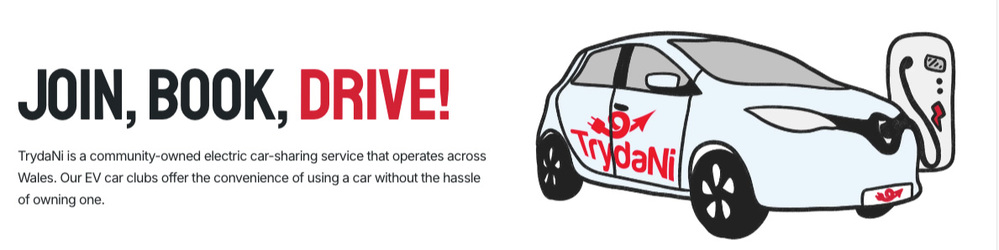 TrydaNi is a community-owned electric car-sharing service that operates across Wales. Our EV car clubs offer the convenience of using a car without the hassle of owning one. TrydaNi is the evolution of the Llani car club and Mach car club that was started in the 90s and now there are 10 car clubs across Wales, each car accessible through an app that allows you to join the car club (approval can take up to 3 days), book the cars and drive away!